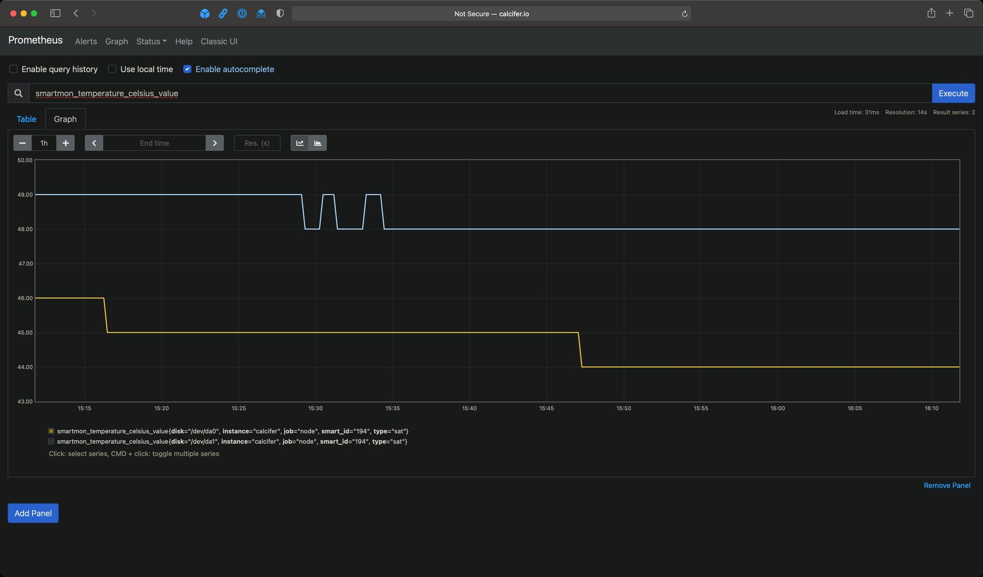 After that’s done and first results will land in the given directory, the new entries will appear in Prometheus. The one I was interested in the most issmartmon_temperature_celsius_value: