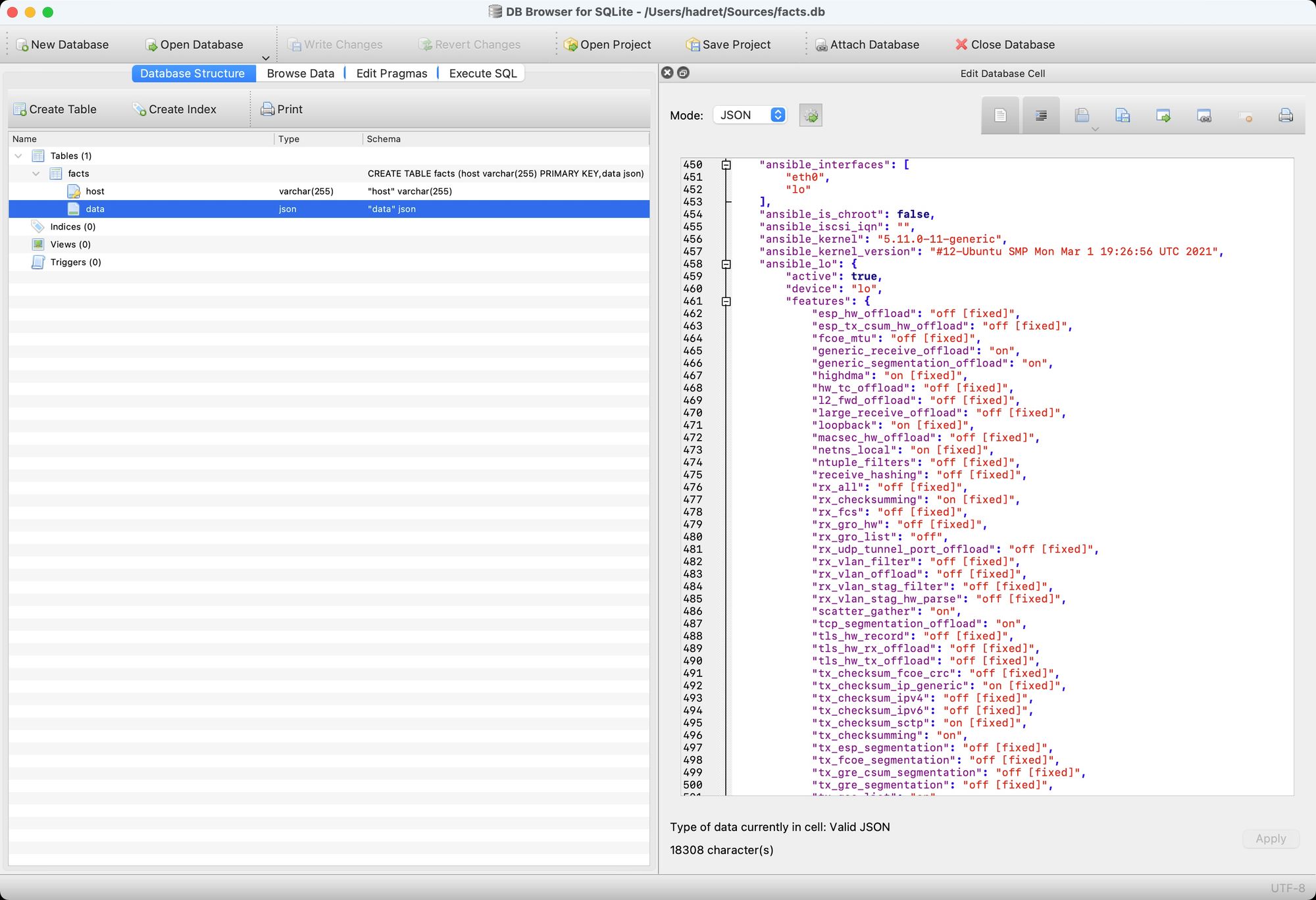 Next step was to create table for storing the data, but only when it’s not already there (hence CREATE TABLE IF NOT EXISTS) and then the loop kicks in to store or replace the data (hence REPLACE INTO ). I’m using hostname as unique key (taken from the facts directly via [host_json["ansible_fqdn"]) and then I push the entire JSON into the data column. It’s very simple and ultra fast.