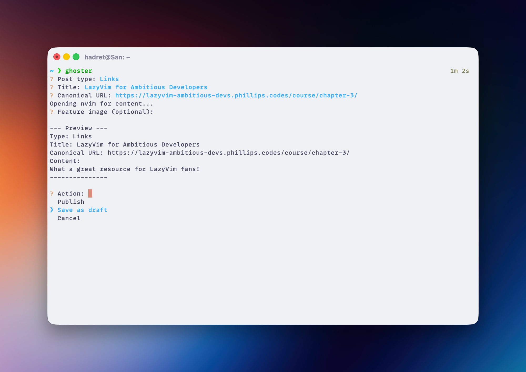 The flow is simple: choose between a status and a links post, open neovim to enter the content, provide a local path to an image if you want it featured in the post and then either publish the shit out of it directly or simply save it as a draft for later posting. A lot of stuff is done for me in the background, like handling the image upload and setting the title and the tag, I can just smash it real fast and publish in seconds. Adding a links post is a bit more involved as this one requires title and canonical_url in addition to the content, but that's roughly it and the rest of the flow remains the same:
