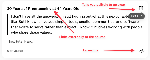 - Links, where title is linking to the external article in a Daring Fireball style
